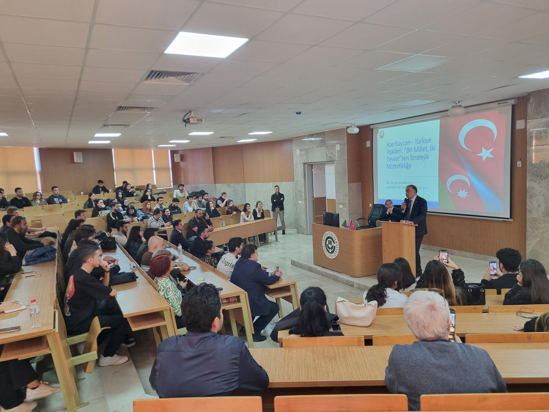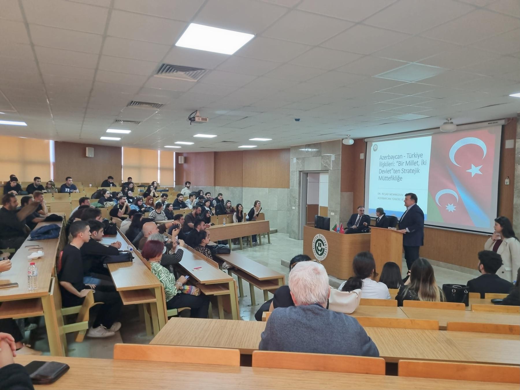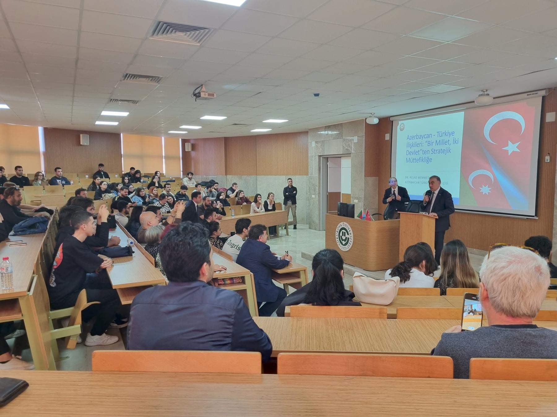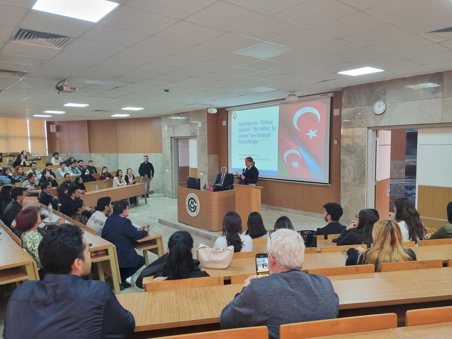 Azerbaycan Cumhuriyeti Türkiye Büyükelçisi Dr. Rashad MAMMADOV'un katılımlarıyla "Kardeşlikten Stratejik Ortaklığa: Türkiye ve Azerbaycan’ın XXI. Yüzyıl Vizyonu" başlıklı bir söyleşi düzenlenmiştir. Siyaset Bilimi ve Uluslararası İlişkiler Bölümü Öğretim Üyesi Sayın Prof. Dr. Harun ARIKAN'ın moderatörlüğünde düzenlenen söyleşinin açılış konuşmasını, İktisadi ve İdari Bilimler Fakültesi Dekanı Sayın Prof. Dr. Erkut DÜZAKIN gerçekleştirmiş.