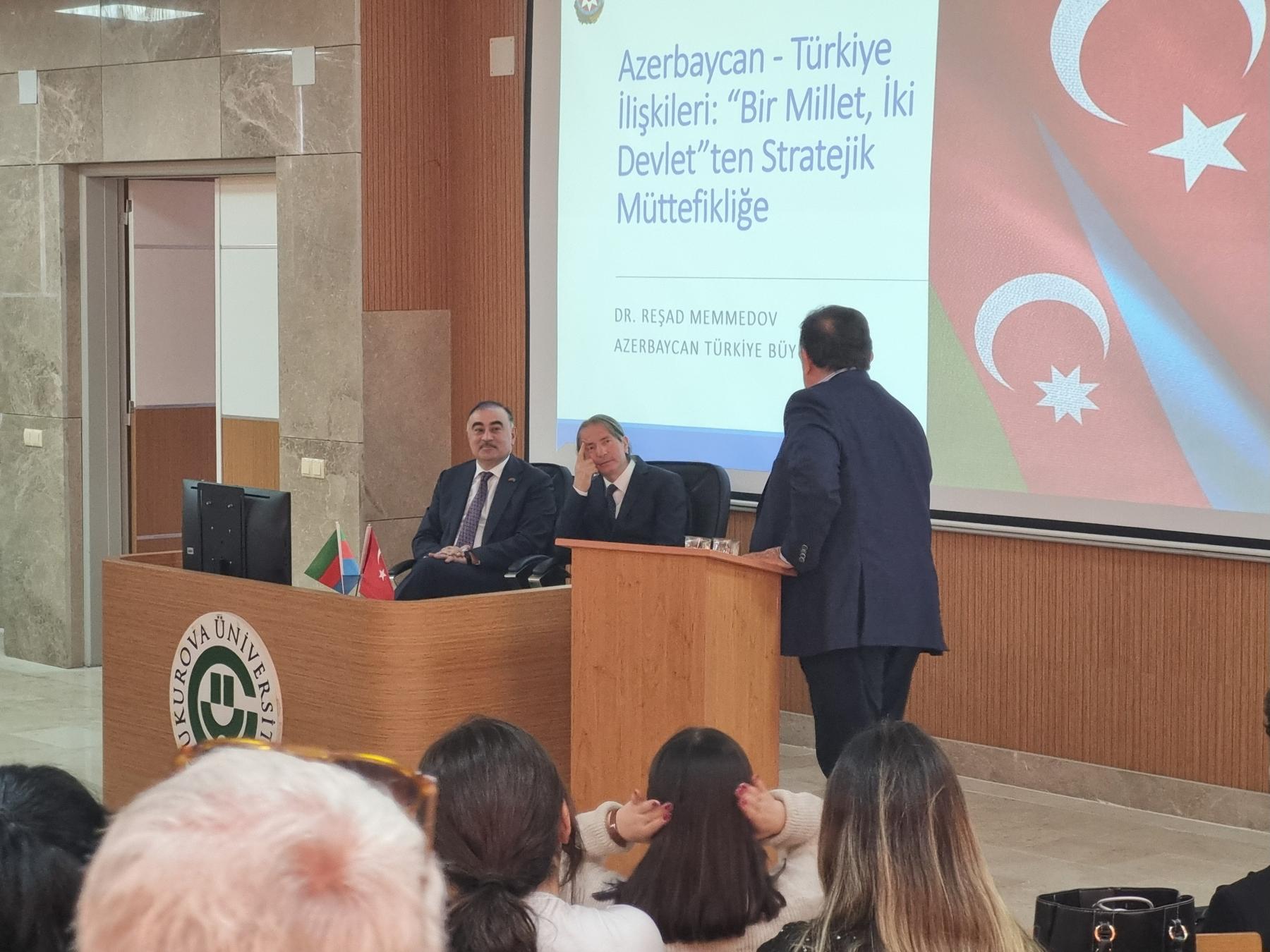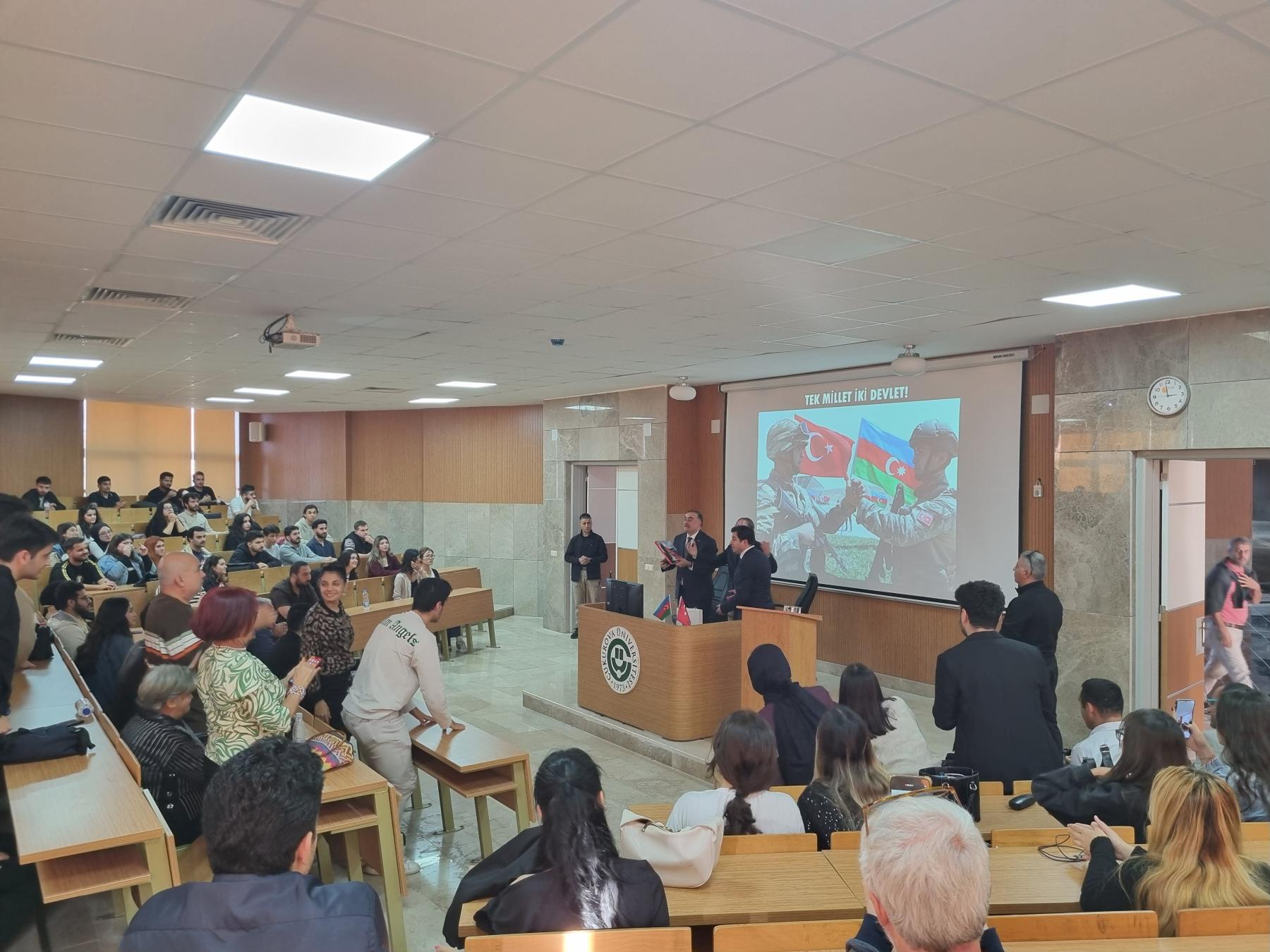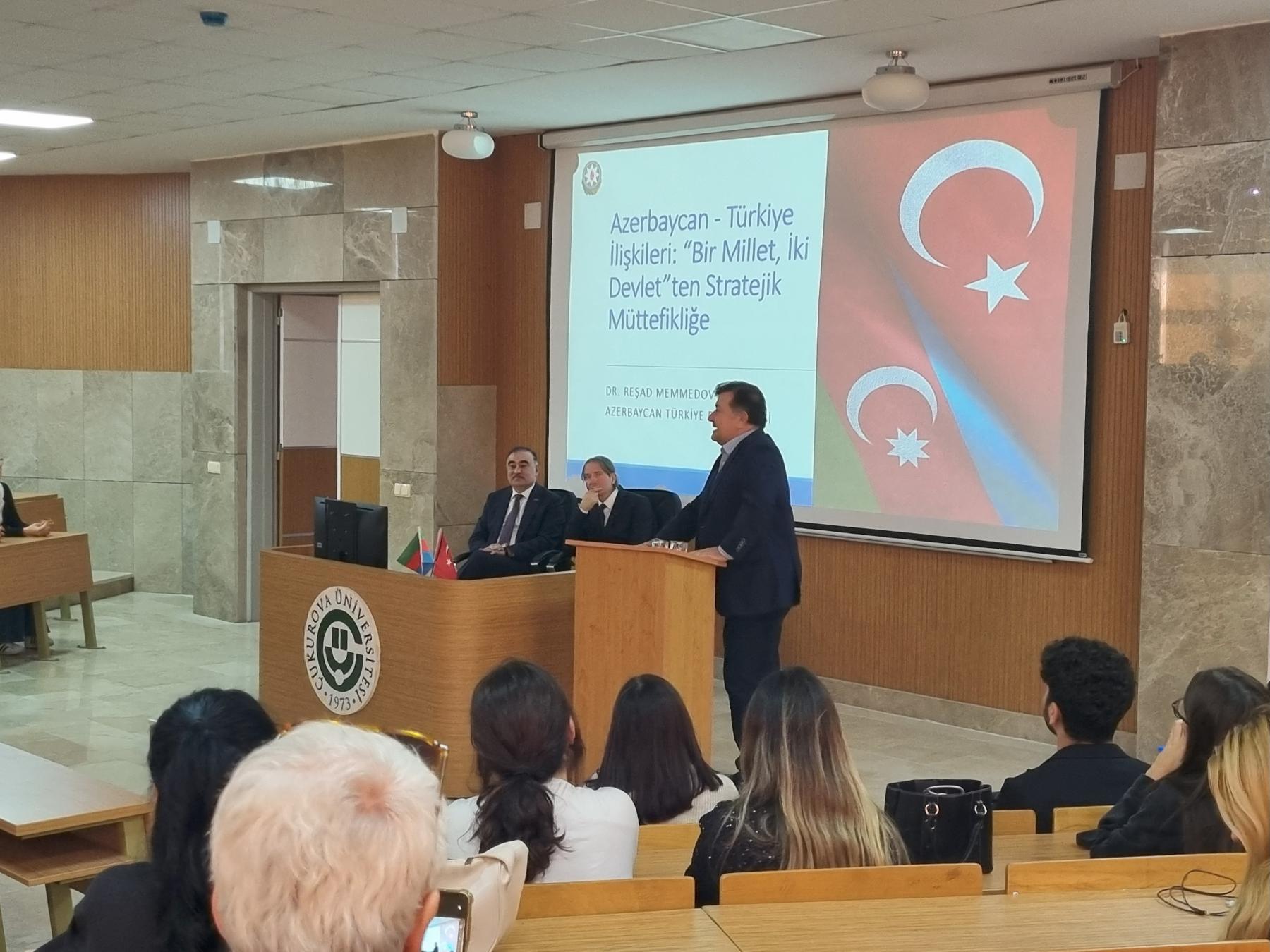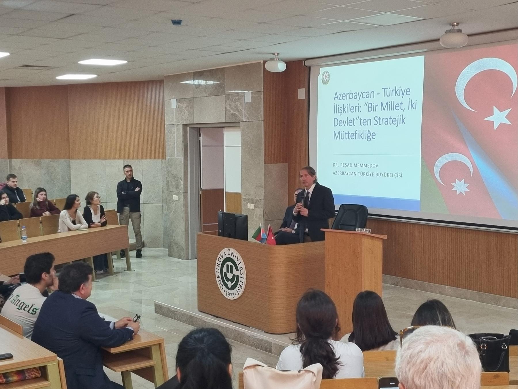 Azerbaycan Cumhuriyeti Türkiye Büyükelçisi Dr. Rashad MAMMADOV'un katılımlarıyla "Kardeşlikten Stratejik Ortaklığa: Türkiye ve Azerbaycan’ın XXI. Yüzyıl Vizyonu" başlıklı bir söyleşi düzenlenmiştir. Siyaset Bilimi ve Uluslararası İlişkiler Bölümü Öğretim Üyesi Sayın Prof. Dr. Harun ARIKAN'ın moderatörlüğünde düzenlenen söyleşinin açılış konuşmasını, İktisadi ve İdari Bilimler Fakültesi Dekanı Sayın Prof. Dr. Erkut DÜZAKIN gerçekleştirmiş.